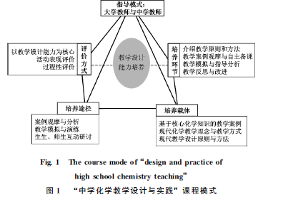 北京师范大学“中学化学教学设计与实践”,俗称“小组课”,服务于中学化学职前教师教学设计与实施能力培养,授课对象以有意向成为中学化学教师的高等院校化学专业的学生为主。该课程以教学设计能力培养为核心,以先进的教学理念和教学方式为主要内容,采用任课教师、一线中学教师双轨指导模式以具体教学模拟和研讨为主要的培养途径,多条线索并进,让师范生通过具体的教学演练和优秀教学案例观摩,在教学设计方法和技能、教学观念和教学方式、教学实践能力等多方面都有提高和发展,并采用多样化评价手段对学生进行综合评价。其课程模式如图1所示。