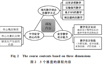 课程的内容构架与当前的基础教育课程改革和中学化学新课程紧密相和,可以从3个维度展开,如图2所示。(1)按照初中和高中2个学段、化学概念原理和元素化合物知识2大内容类别、高中必修和高中选修2个水平层次、学术性模块和应用性模块2大内容取向,分别精心选取中学化学教学的核心内容和课堂教学案例作为学员课程研讨的素材和学习资源。(2)紧密结合现代教学论和教学方式改革的热点专题,培养学生的现代教学理念,如基于知识启发的讲授教学、sts取向的教学、实验探究的教学和观念建构的认识发展教学。(3)以“教学设计能力”为核心发展目标。化学教学设计能力由教学设计知识和教学设计技能组成,其中,教学设计知识包括教学设计程序性知识以及教学方法和方式的知识。教学设计技能包括分析、设计、呈现和评价4个部分,与完整的教学设计流程相对应。教学设计知识对教学技能的发展有引导作用,同时,教学技能的增加和进步将进一步完善教学设计知识。