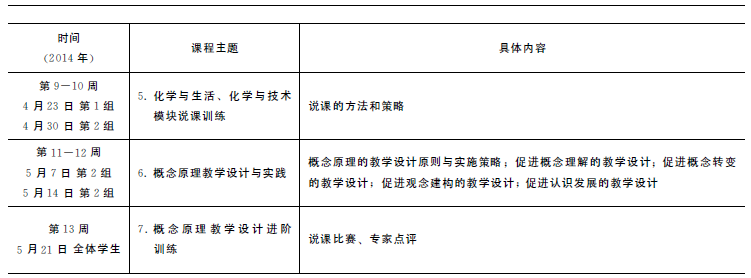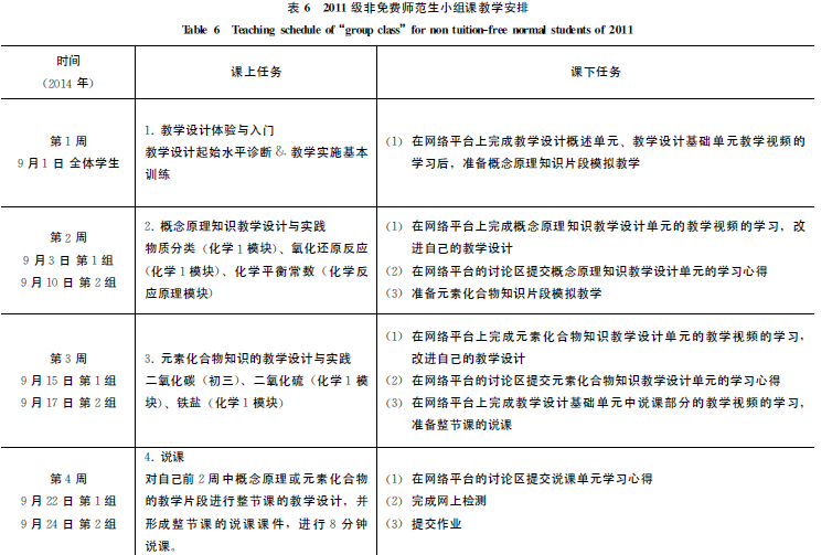进的二次实践体验。另外,1名学生只能在1位老师课上学习,没机会体验其他教师的风格,整个课程缺少教师团队的协同与共建。为此, “中学化学教学设计与实践”教学团队尝试将mooc课程的理论学习和线下实践课程结合,在2011级非免费师范生中进行试运行。学生需要在课前完成该主题的理论学习,案例观摩,然后按照不同主题风格进行教学设计,再在课堂上进行实践提升。具体课程安排见表6。