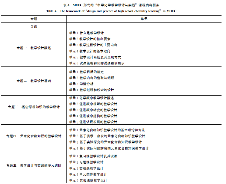mooc (massive open online course),即“大规模在线开放课程”,是近年来开放教育领域出现的一种新课程模式,具有开放性、大规模、自组织和社会性等特点[14]。2008年,加拿大爱德华王子岛大学的dave cormier、国家通识教育技术应用研究院的bryanalexander针对西蒙斯和道恩斯联合开设的cck08课程提出mooc术语[15]。网络课程平台应运而生,包括斯担福大学创办的udacity平台和coursera平台、哈佛大学与麻省理工大学合作的edx平台等。随后国内中文平台也相继推出,包括清华大学的“学堂在线”和北京师范大学的“京师在线”平台。北京师范大学化学教育研究所的教学团队率先在“京师在线”网上建设“中学化学教学设计与实践”的慕课(http://mooc.bnu.edu.cn/courses/bnuchem/chem01/201405/info)。课程视频总学时约16小时,构建了理论学习与能力训练相结合的双线索进阶性的课程内容体系,共设置为5个课程专题,如表4,每个课程专题下又设4~6个内容单元,分别由教学团队的不同教师主讲,每个内容单元包括4~8个微教学视频,时长5~15分钟不等。特别在专题五(教学设计与实践的多元进阶),请多位一线教师介绍复习课、习题课、实验课教学、单元整体教学以及其他课型教学(如翻转课堂等)的教学设计。