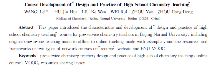 建与形成的教学能力决定着初入职阶段教学工作的起点,影响着教师专业发展的方向与空间。为此,师范生教学能力培养一直被各个高师院校重点关注。20世纪80年代初就有研究者采用电视录像的形式来帮助师范生熟悉化学教学过程[1]。已有研究表明师范生化学实验教学能力较低[2],教学设计能力和实施能力存在城乡差异[3],视频案例教学对培养学生教学能力的提升有明显作用,尤其是与微格教学相结合的形式得到广大学生的认可[4]20世纪90年代,北京师范大学化学教育教研室在国内首次推出针对师范生的化学教学设计训练的实践类课程“化学教学设计与实践”和“化学教学论”,并提出了师范生全程渗透、全程培养、全面发展的培养模式[5]。课程以学生实践训练为主,教师指导为辅,并以小组互助的形式进行[6]。之后几年团队不断进行课程改革和创新,丰富和完善了中学化学教学方法和手段[7]。南京师范大学[8]、华中师范大学[9]等其他高师院校也纷纷开设了类似课程。尽管关于师范生教学能力培养的研究和课程都已经较为丰富和多样,但是在21世纪的今天,单纯课上的训练已经不能满足教学需求。随着互联网和移动智能终端的快速发展,在线网络课程的应运而生[10],“中学化学教学设计与实践”也开始了网络课程的建设,其中以爱课程网和京师在线网为主要构建平台。