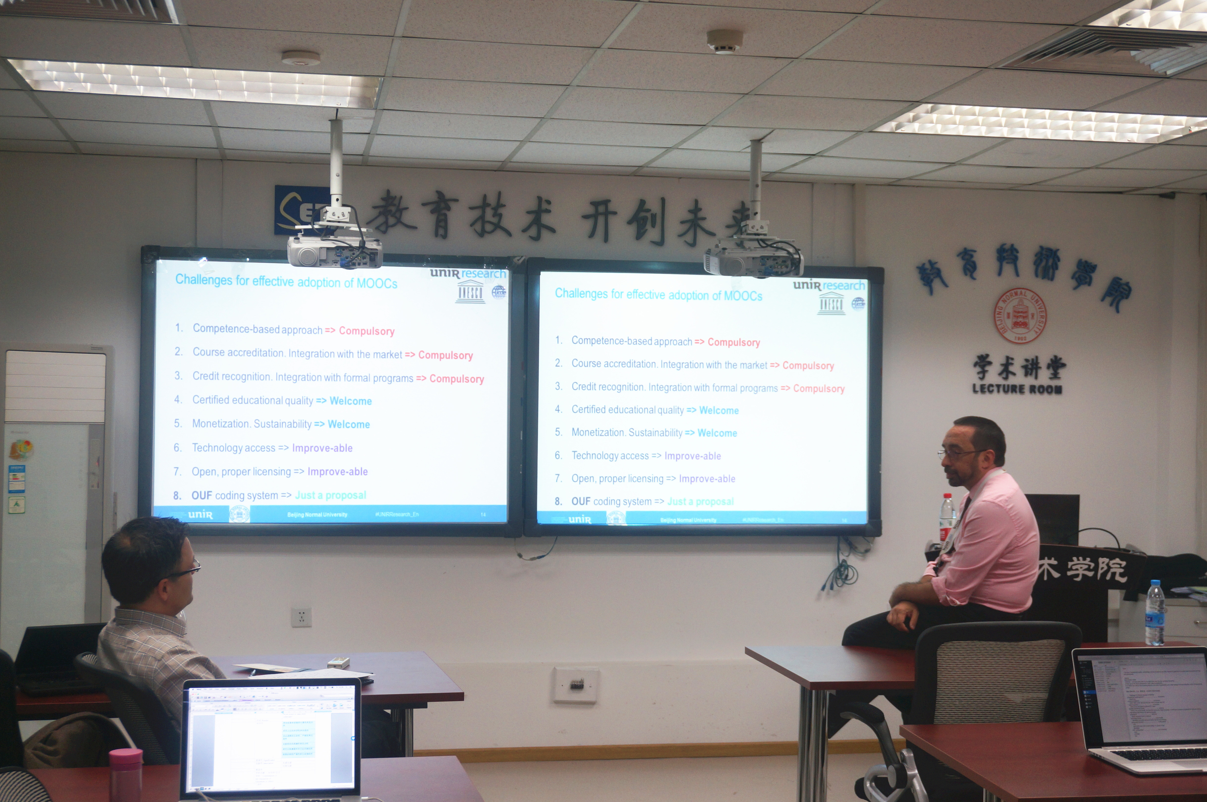 prof. daniel firstly explained the meaning of moocs and differentiate it with traditional teaching modes. he also analyzed the problems facing moocs and oer, such as a lack of a standardized quality, methodology, service provision or any other measure to guarantee an excellent learning process and high user performance. the most important part of his lecture is that he pointed out the challenges for effective adoption of moocs, including a competence-based approach, course accreditation, credit recognition, certified educational quality (e.g. educational methodology), monetization, technology access, proper licensing and ouf (open, universal and free) coding system for educational system. finally, prof. daniel had a fierce discussion with attendees on how to improve the situation of moocs in china.