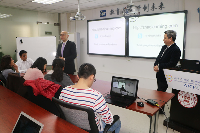 on january 13, 2017, professor yong zhao visited advanced innovation center for future education (aicfe) at beijing normal university. he is a foundation distinguished professor in the school of education at the university of kansas. he is also a professional fellow at the mitchell institute for health and education policy, victoria university in australia. in addition, he is an elected fellow of the international academy for education and has ranked as the top 10 education scholars in public influence in the u.s. in the morning, professor zhao had an academic exchange meeting with directors and staff at aicfe. in the afternoon, professor zhao delivered a lecture on an education paradigm shift: why and how, which attracts around 60 audience offline and more than 400 audience online.