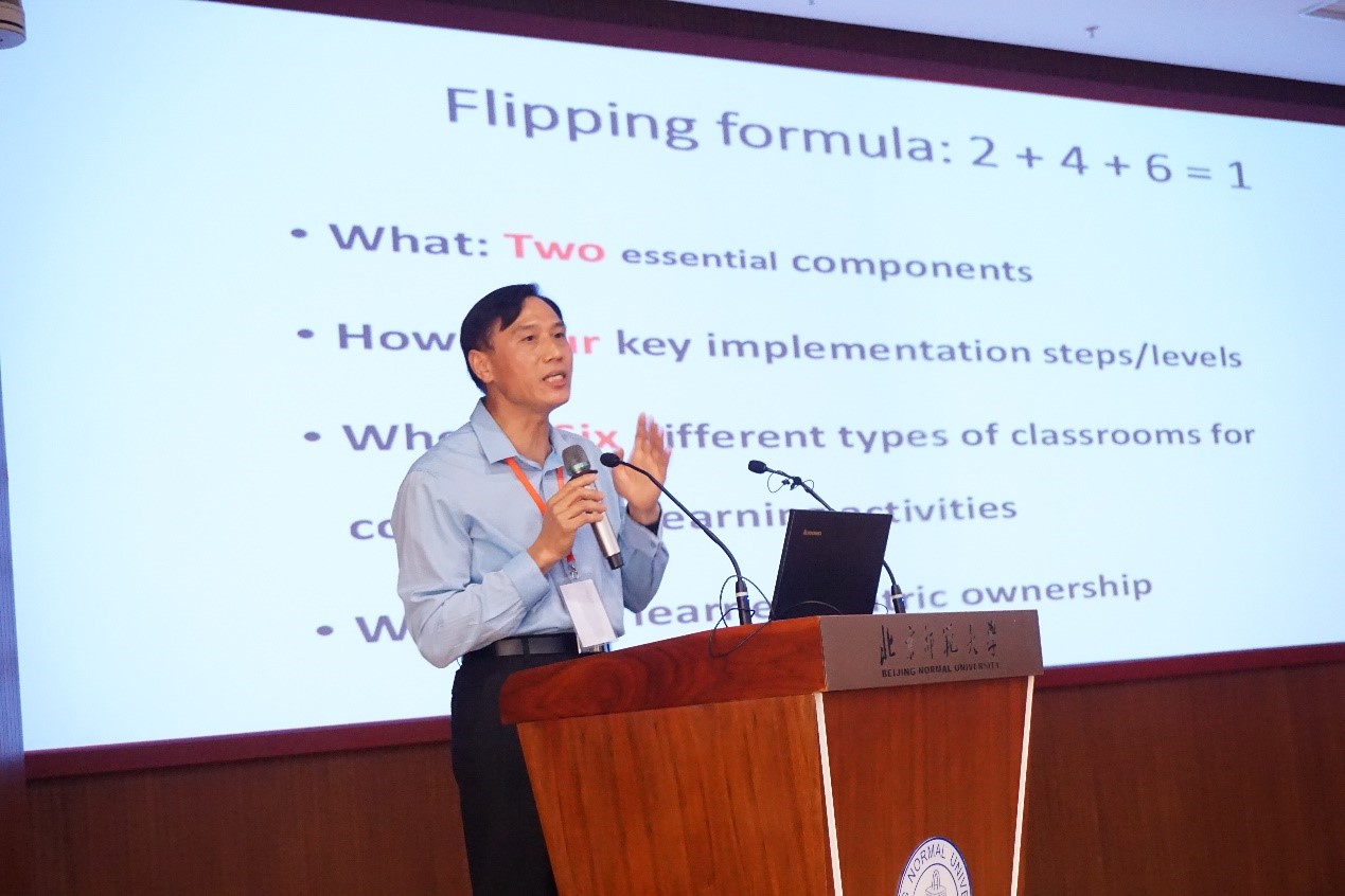on the morning of june 6th, prof. nian-shing chen, department of information management at national sun yat-sen university in taiwan, made a keynote speech entitled "flipped classroom teaching and learner autonomy." he described the concepts, designs and implementation strategies of flipping courses. first, he explained the significance of the two parts of the course: pre-recorded interactive video lectures and highly interactive learning activities. in addition, he also mentioned teachers can teach in six different types of venues, including physical classrooms, asynchronous cyber classrooms, synchronous cyber classrooms, mobile classrooms, social classrooms and ubiquitous classrooms. in the implementation phase, he proposed a four-stage systematic approach to help teachers to effectively conduct an flipping course. these four stages are designing learning content, leading learning activity, guiding students with specific learning difficulties, and managing good learning atmosphere across multiple learning spaces.