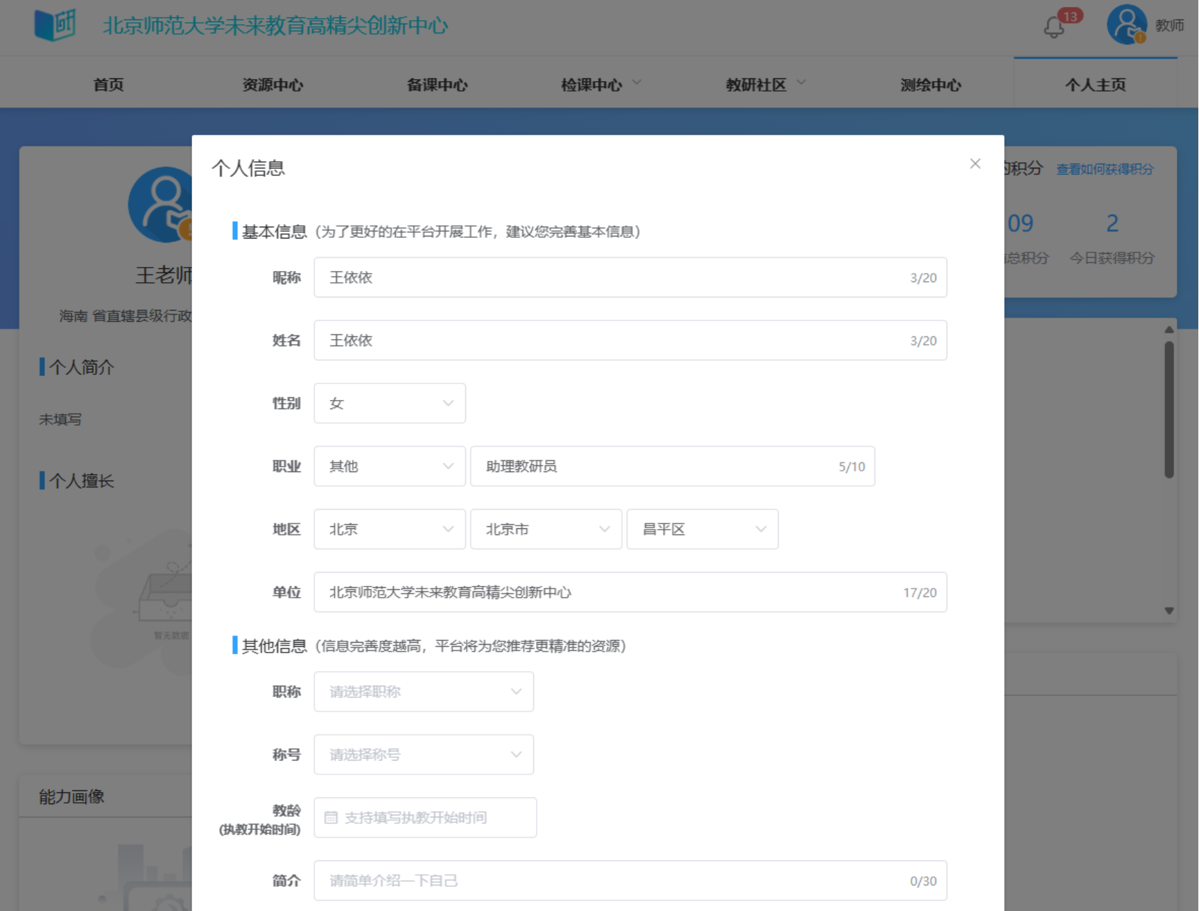 (3)完善个人信息:访问“个人全讯5123主页”,根据个人实际情况如实且完整填写个人信息,此信息将与作品获取信息关联。