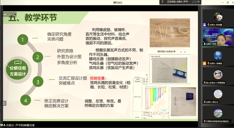 尹平作《欢乐好声音》案例分享。案例设计了丰富的活动让学生探索音调高低、强弱和震动的关系,最后来设计一个简易乐器,学生通过交流合作的方式改进完善自己的设计,教师从多个维度也搭建了探究支架,引导了学生进行思考,提升了学生分析问题的能力和设计思维。