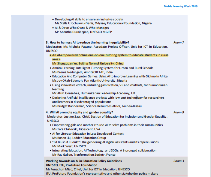 中心执行主任余胜泉在mobile learning week 2019,围绕“如何利用人工智能来减少学习不平等?”议题,面向国际学者,介绍了北京通过开放辅导的一对一在线系统为远郊区学生带来的优质教育资源和教育公平。
