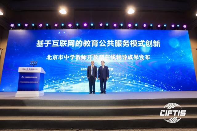 在开幕式成果发布环节,北京市教育委员会主任刘宇辉先生、北京师范大学校长马骏先生共同发布了主论坛成果《基于互联网的教育公共服务模式创新-北京市中学教师开放型在线辅导计划》(简称“开放辅导”)。