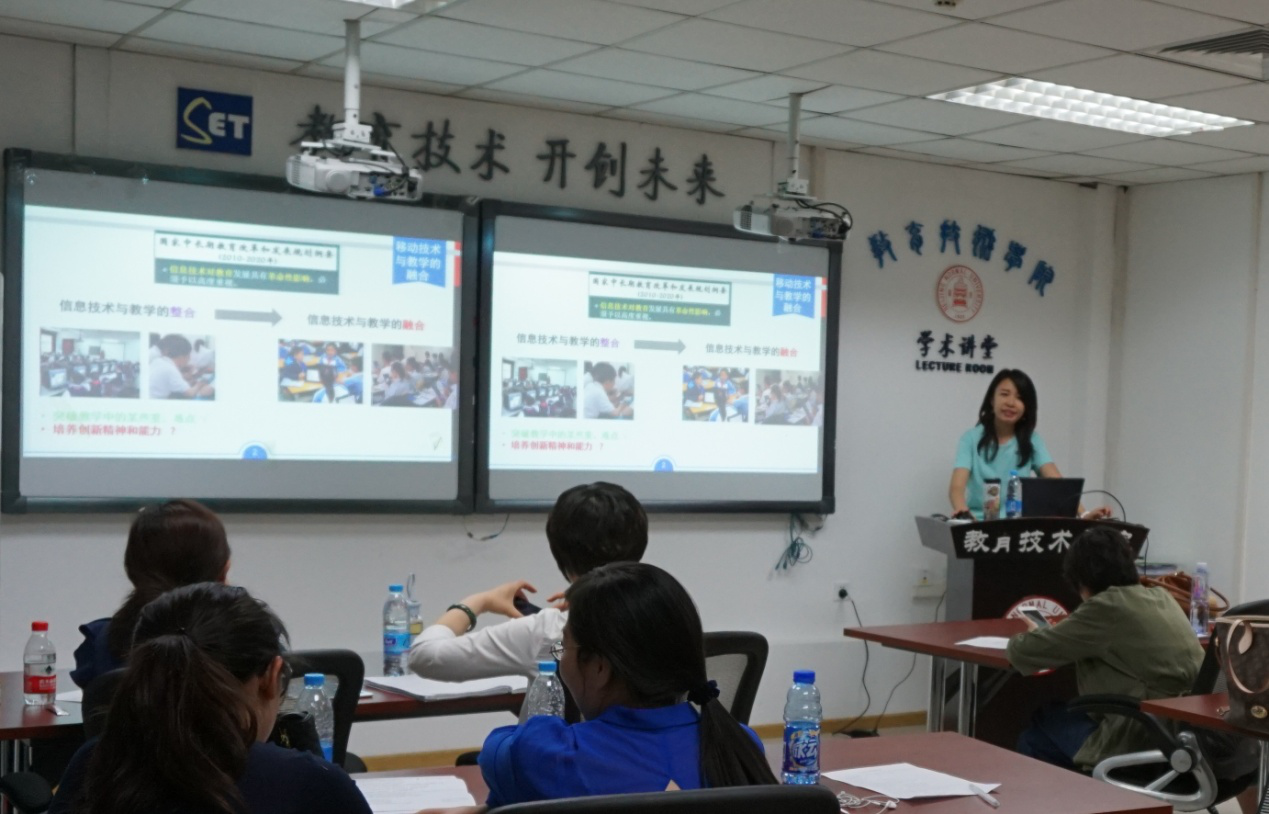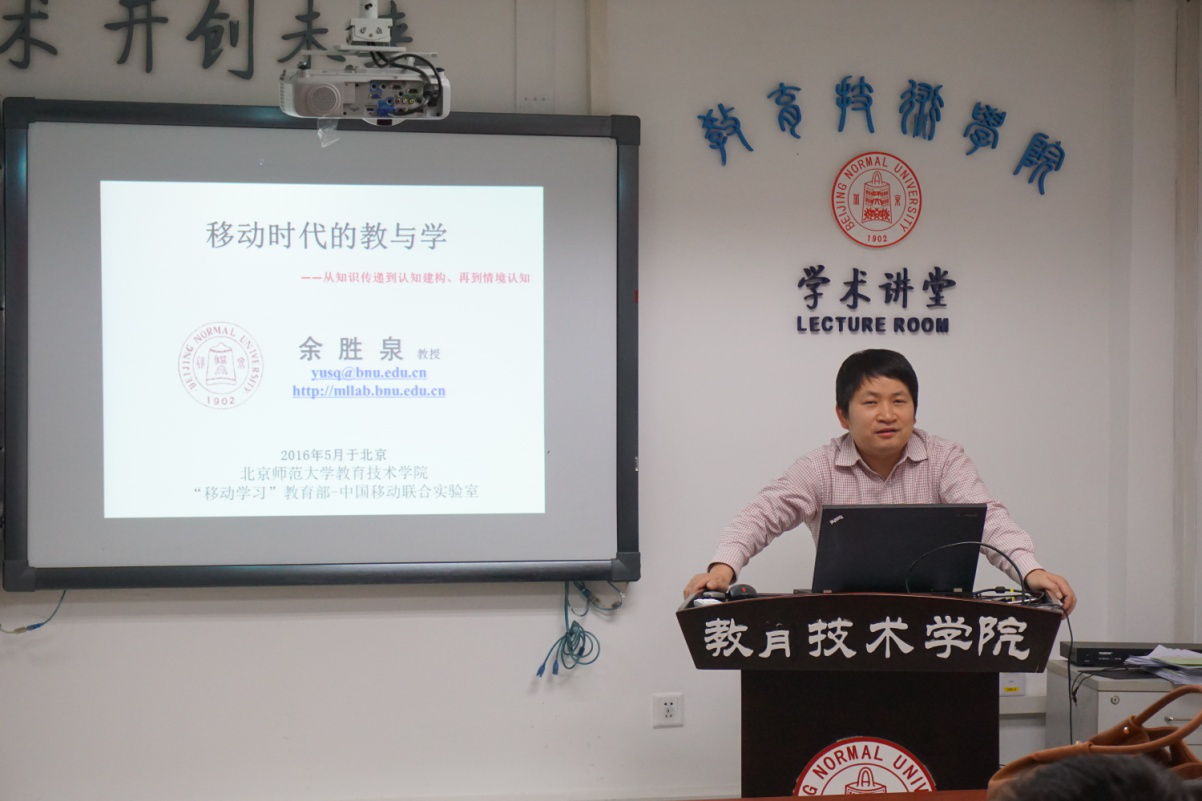 2016年5月11日下午2:00,北京师范大学未来教育高精尖创新中心执行主任余胜泉教授和崔京菁博士在演播楼208会议室分别就“移动时代的教与学”和“移动技术与教学的融合”主题为东城区中小学教师进行了教学培训。