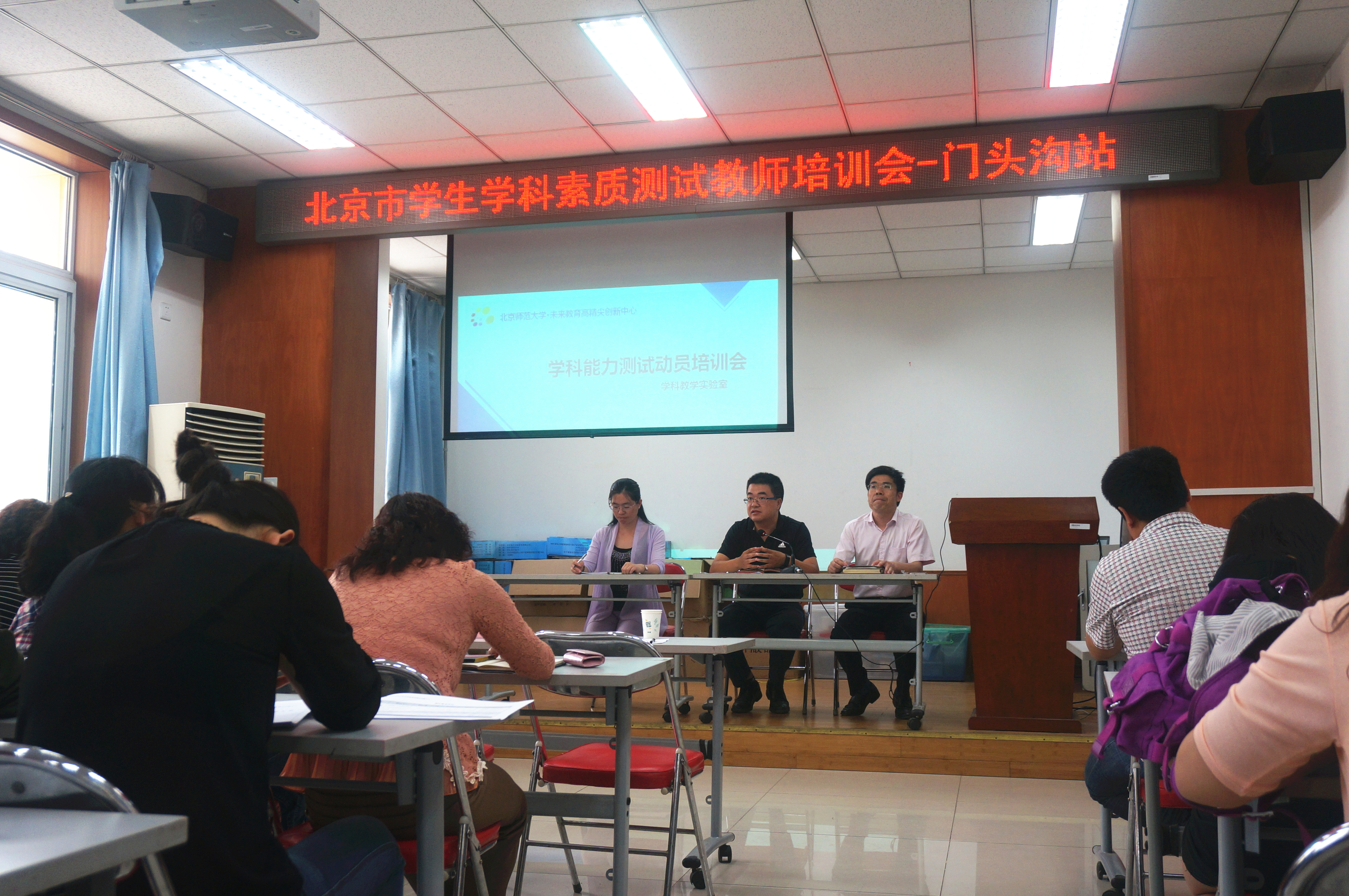 2016年5月23日下午,北京师范大学未来教育高精尖创新中心学科能力测试动员培训会在门头沟区新桥路中学顺利举办。来自大峪中学分校、新桥路中学、京师实验中学、大峪中学西校区、三家店铁路中学、王平中学的40余名学科教师以及中心学科教学实验室等10名教师参加了此次培训。