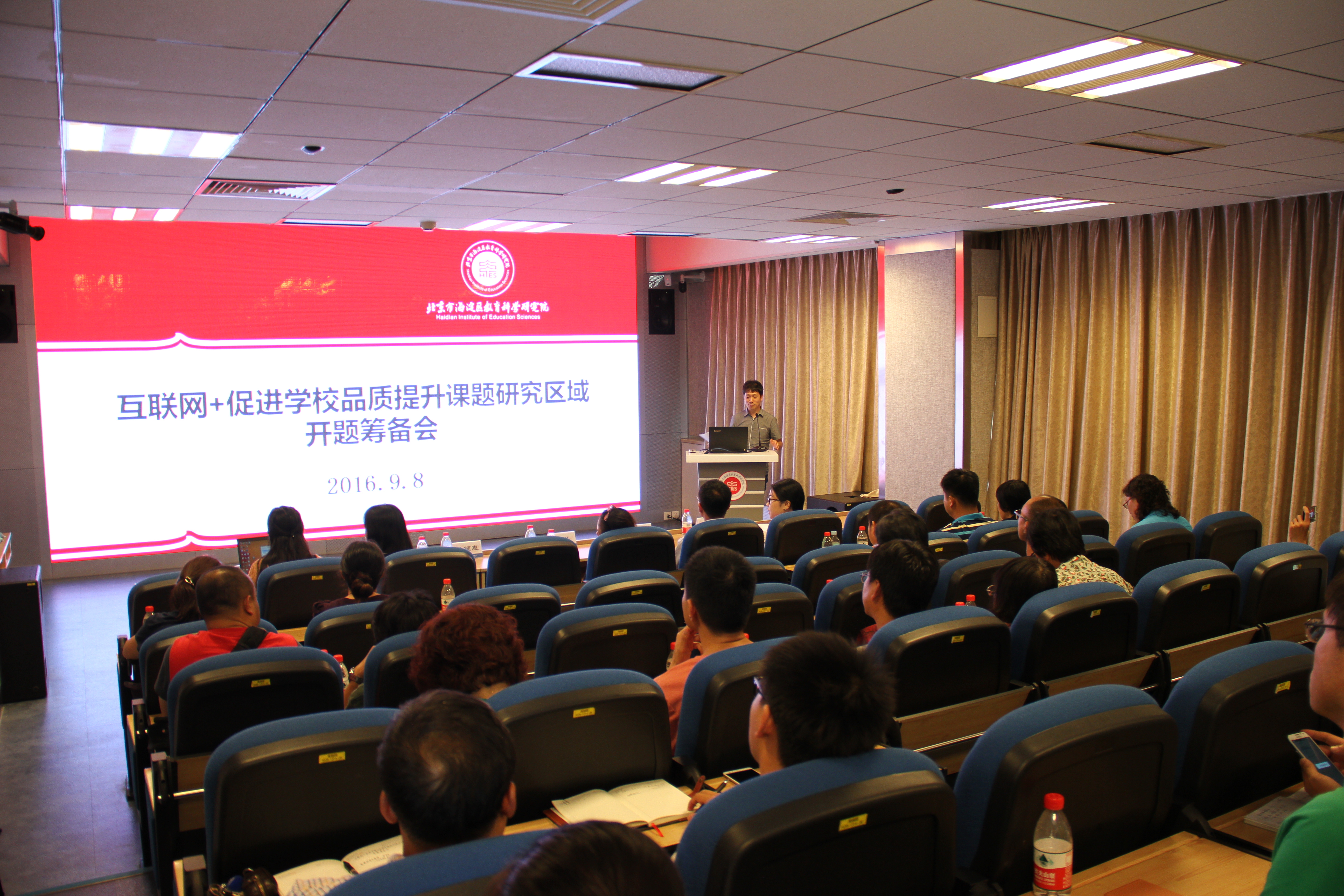 2016年9月8日,互联网 促进学校品质提升课题研究区域开题筹备会在北京市海淀区教育科学研究院阶梯教室顺利召开。北京市海淀区教育科学院现代教育技术中心主任王有学主持本次会议。会上,教育部教育部教育管理信息中心研究室副主任董晶关于整个互联网 课题研究工作给出指导意见;北京师范大学未来教育高精尖创新中心王旭详细介绍了互联网 促进学校品质提升子课题的相关内容;北京师范大学未来教育高精尖创新中心宋佳宸介绍未来学校白皮书;海淀区15所重点中小学负责人及代表参加了本次会议。