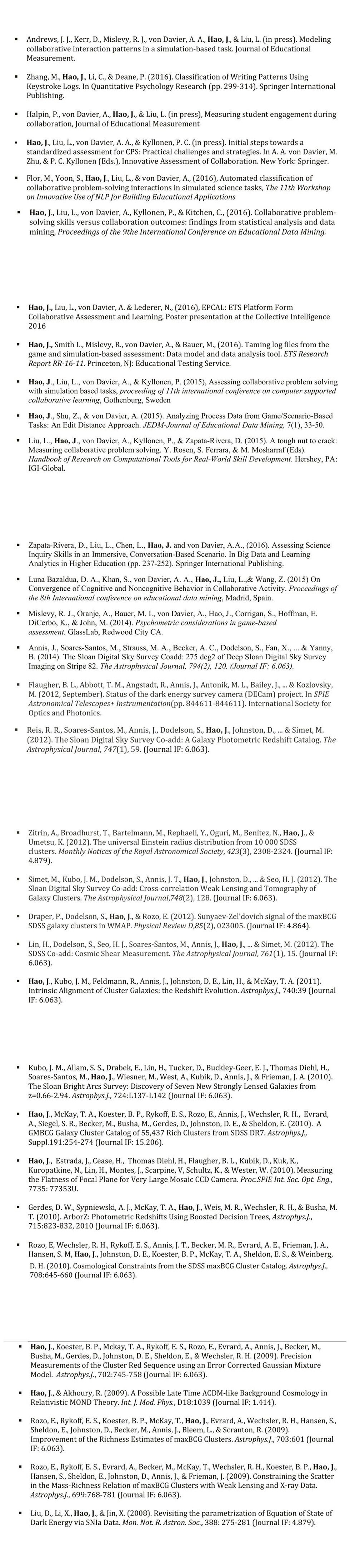郝建纲博士是美国教育考试服务中心(ets)计算心理测量研究中心的高级研究科学家。他共同领导了 ets 的游戏、模拟和合作计划的基础设施子计划,也是 ets 多个研究项目的主要研究者,从而设计基于游戏/模拟的评估,基于网络的平台(用于合作评估),以及数据分析包(用于基于游戏的评估)。这使他获得了 2016 年的 ets 总统奖。郝建纲博士在密歇根大学获得了物理学博士学位和统计学硕士学位。在加入 ets 之前,他在费米国立加速器实验室致力于建模和挖掘天体物理学中的 t 级数据,并创建了多个能在 python 和c 中广泛使用的数字图像分析软件包、测量误差校正高斯混合模型和概率聚类分析。他的工作已被领先的技术媒体广泛报道,如美国 wired(连线)杂志和《麻省理工科技评论》。他发表了 40 多篇同行审评论文,总引用次数超过 2500 次,h 指数为26。