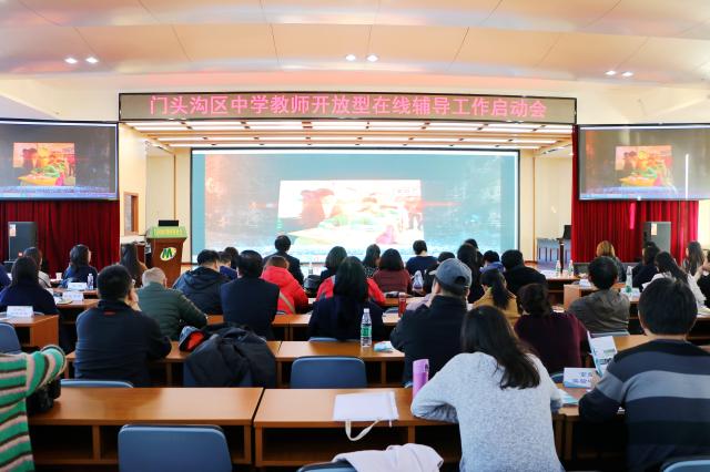 2019年11月11日下午,北京市门头沟区中学教师开放型在线辅导工作启动会在大峪第二小学召开。门头沟区委教育工委组织人事科科长李娜,教师进修学校校长胡国友、副校长周强、教育培训中心主任丁宏伟、中学研修中心副主任王朝华等领导出席会议;北京师范大学未来教育高精尖创新中心项目团队成员郭晓珊、雷韵玉、顾璇、黄巧艳、赵心钰、刘国名,以及门头沟区各中学校长、教学副校长、教学主任、骨干教师、各校计算机老师等60余人参会。启动会由周强副校长主持。