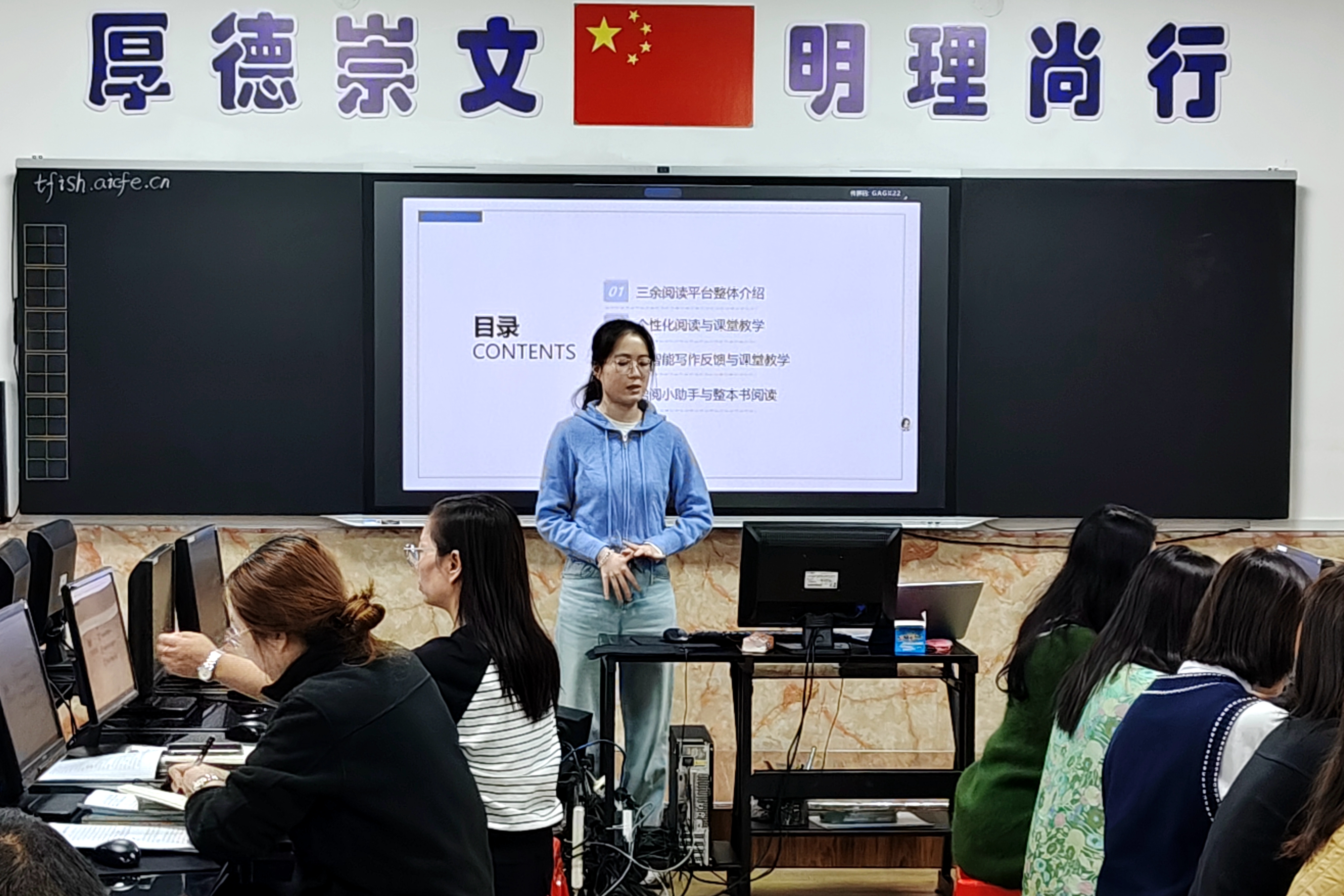 10月15日上午,课题组成员陈诗雅面向全校语文教师开展三余阅读在语文教学中的应用专题培训。培训内容重点介绍三余阅读平台的阅读能力画像、个性化阅读推荐、ai 写作反馈和启阅小助手等新兴功能,详细讲解其在语文211课堂教学、写作教学和整本书阅读中的具体应用场景,助力教师掌握平台用法以提升语文教学质量。陈诗雅和陈秋旭围绕外研社 2025 版小学英语新教材,帮助学校英语老师梳理教材大单元结构框架、明确板块教学深度与课时分配、设计课时衔接,并分享教学策略,助力教师提升教学实效。