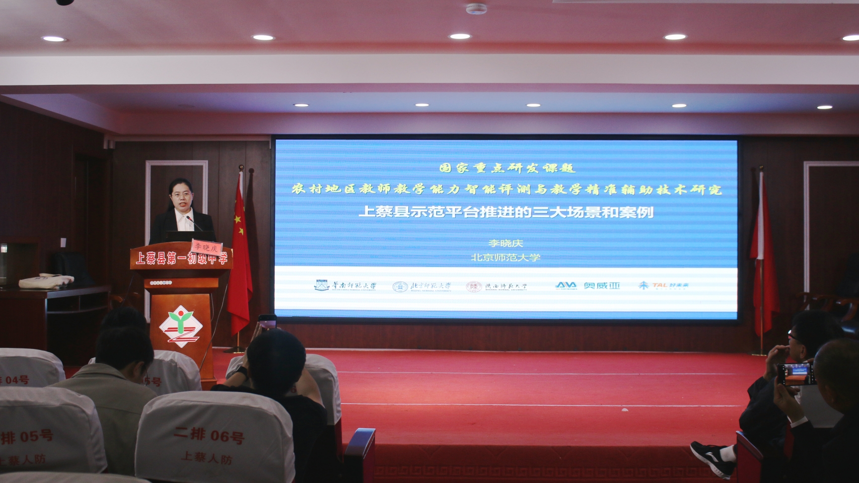北京师范大学未来教育高精尖创新中心学科教育实验室主任李晓庆作“上蔡县示范平台推进的三大场景和案例”主题讲座,通过具体的示范落地模式举例,对“人机结合研课诊课”“校本日常教研”“学校/地区教学比赛”示范平台三大应用场景进行了深度的剖析和解读,详细阐述了如何利用平台智能手段,帮助教师从自主改进教学,到教研共同体研磨教学,再到以赛代练提升能力,逐步提升教学质量和效率。