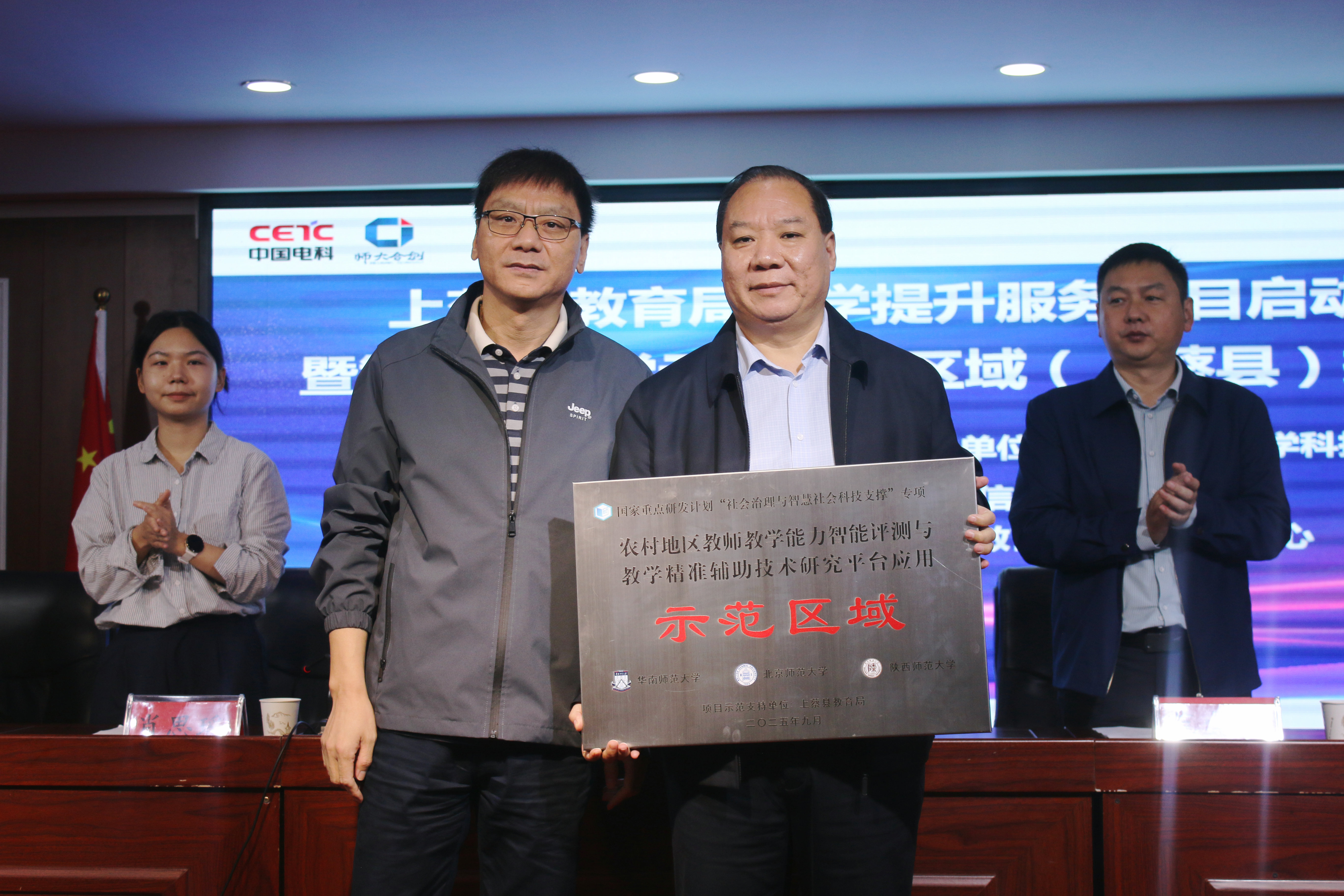 授牌仪式开始,首先,北京师范大学科技集团乡村教育发展中心主任汤本强为上蔡县授予示范区域牌匾,上蔡县教育局局长邱应征接牌。