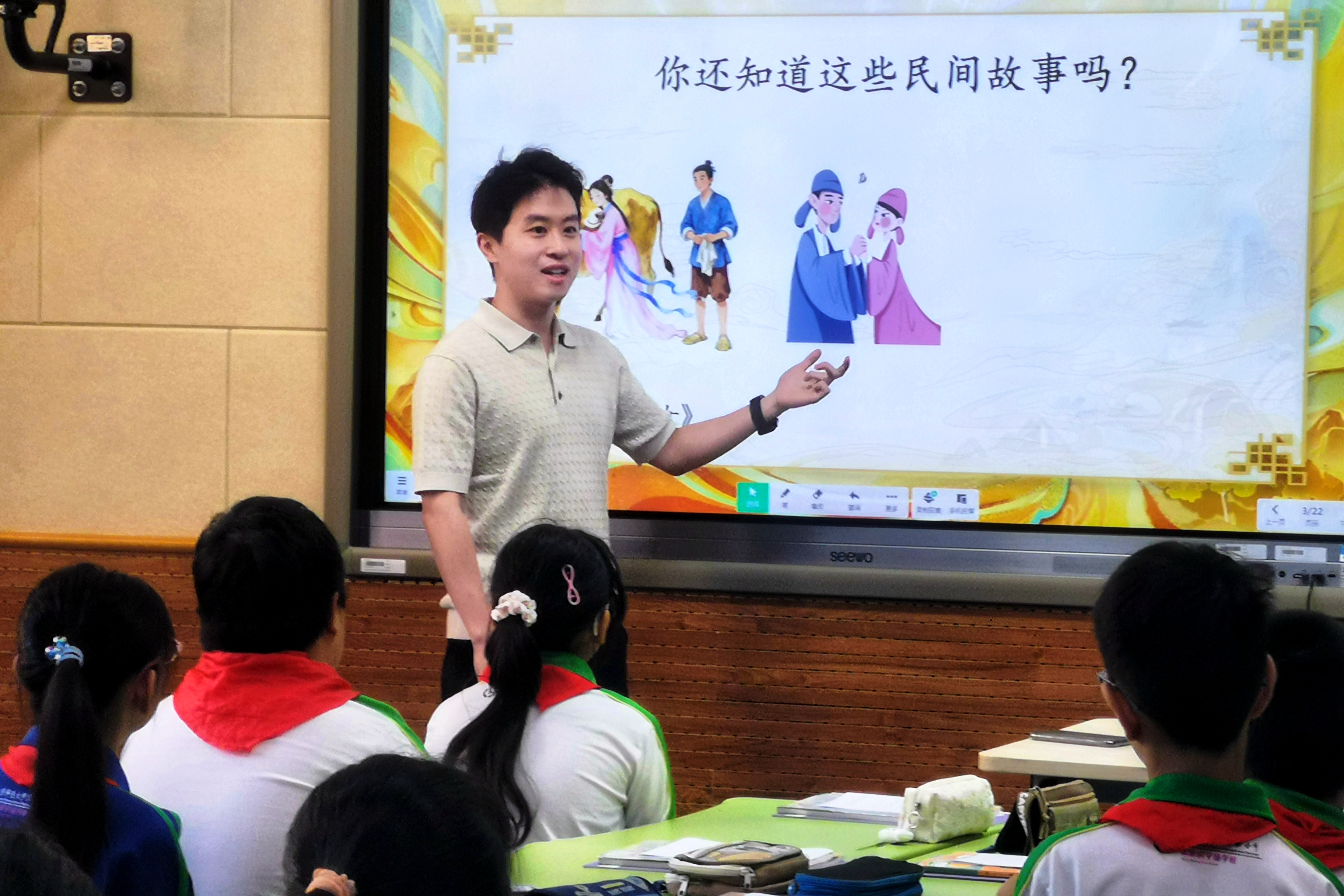 活动分为教学展示和交流研讨两个环节。在教学展示中,北京师范大学实验小学未来科技城学校语文教师李文轩和项目组特邀的马池口中心小学语文教师李静,分别执教了五年级上册第三单元民间故事单元的导读课,以同课异构的方式呈现了精彩的教学实践。两位教师均能从大单元整体视角出发,以单元任务驱动学习。同时,借助点阵笔与三余阅读平台的投票答题功能,高效扫除了字词障碍。通过展示民间故事多样的传播形式,激发学生学习民间故事、阅读民间故事的兴趣。李文轩着重引导学生初步感知“创造性复述”的方法,并通过摘选民间故事内容,让学生初步体会民间故事所承载的人们对美好生活的向往。李静通过故事山、情节链等支架梳理故事情节,进而初步了解民间故事的特点,激发学生阅读民间故事的兴趣。