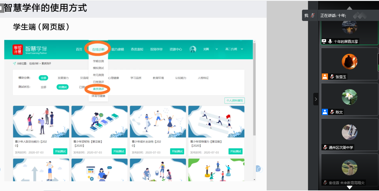 此次开题通过远程在线的方式,子课题负责人从研究目标、研究内容、研究方法、创新点、智慧学伴使用方式等五个方面进行答辩,充分展示了教师对实践教学的深入思考、对研究课题的创新发展。随后,专家针对汇报过程中发现的问题提出意见,对子课题的研究方向进行指导,给予子课题创新点充分的肯定。
