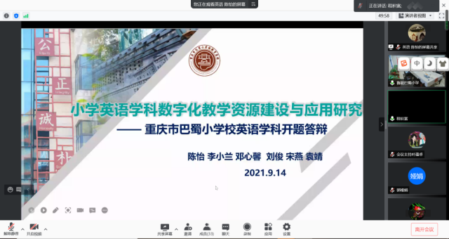 2021年9月14日下午,北师大高精尖中心联合重庆市巴蜀小学组织了“基于大数据的小学核心素养发展研究”课题开题答辩会,四个学科教育类别课题研究团队以语文、数学、英语、科学的学科顺序依次开启答辩,巴蜀小学校长马宏、副校长李永强、巴蜀园执行校长令狐林作为课题组支撑团队为答辩老师们提供了有力的后备支持。北师大高精尖中心学科教育实验室常务主任李晓庆,学科教育实验室主任崔京菁,学科教育实验项目主管张雪玉联袂出席,作为此次开题答辩的评审专家组为研究组老师的答辩汇报进行开题指导。