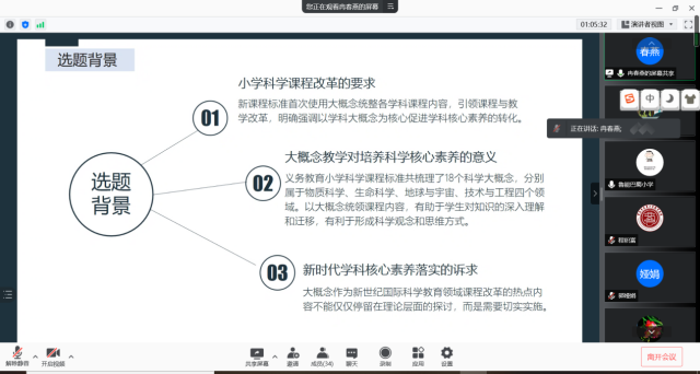 最后,巴蜀小学科学核心素养研究发展组冉春燕在答辩汇报中展示了科学学科的研究目标,规划了大概念统整下小学科学数字化教学资源的系统研发。