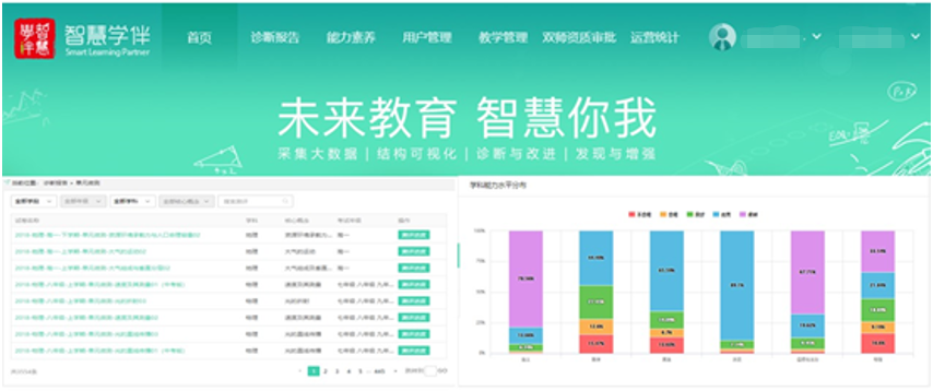 智慧学伴以大数据为基础形成了知识和能力结构的建模与分析,其层级覆盖了学校、年级、班级和个人等多个层面,如学校管理者通过数据和分析更清晰了解本校学情状况,通过数据导向对全校的教学方向进行调整;教师通过数据和分析了解本班学生的实际学习水平和薄弱知识点,帮助教师针对学生特点进行备课、授课,提高教师的教学能力;学生通过数据和分析了解自己的优势学科和薄弱知识点,通过平台推荐进行自我提升。同时,数据库对于成绩管理与教研内容精准定位具有指导和引领作用,形成规范化的管理模式与数据应用机制成为有效应用数据库内容、提升精准研修效果的保障和基础条件。